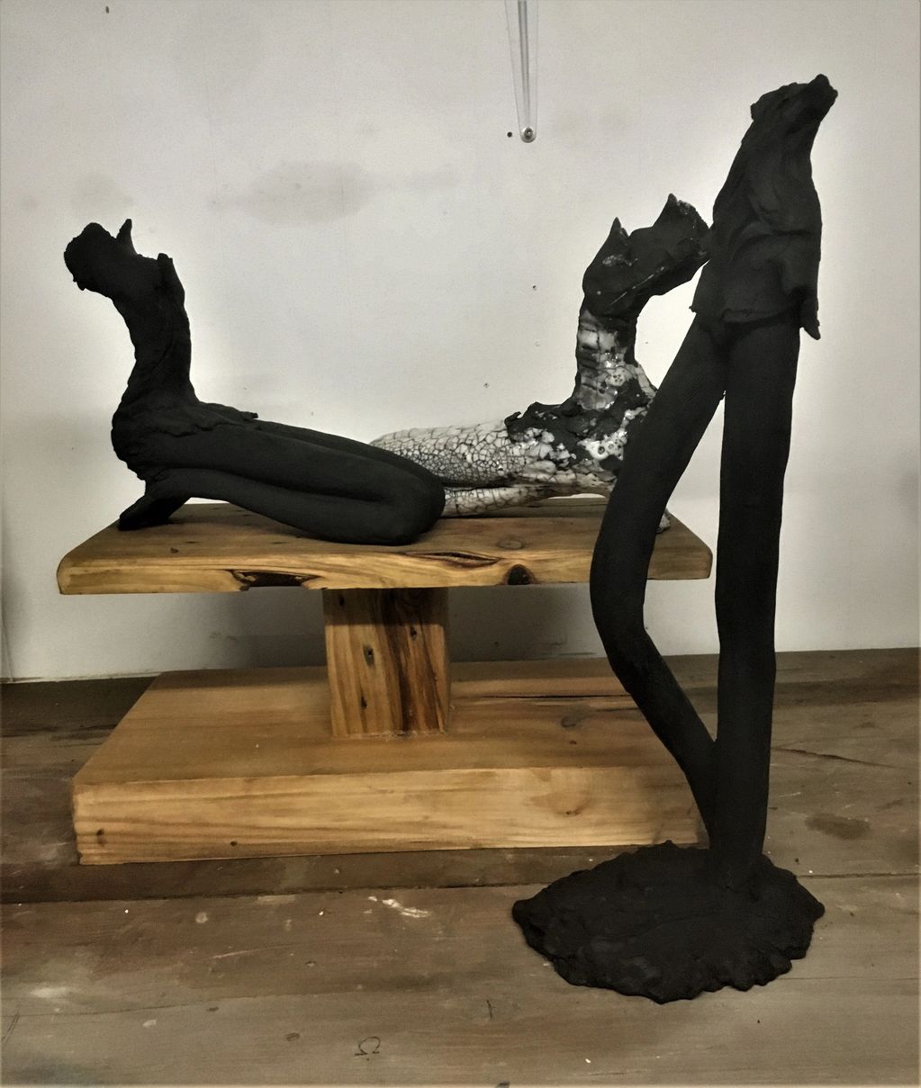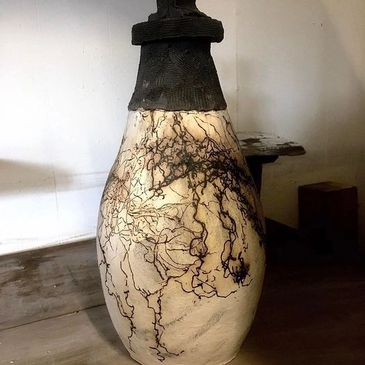 The work is glazed and raku fired in the courtyard a method from Japan associated with the tea ceremony.